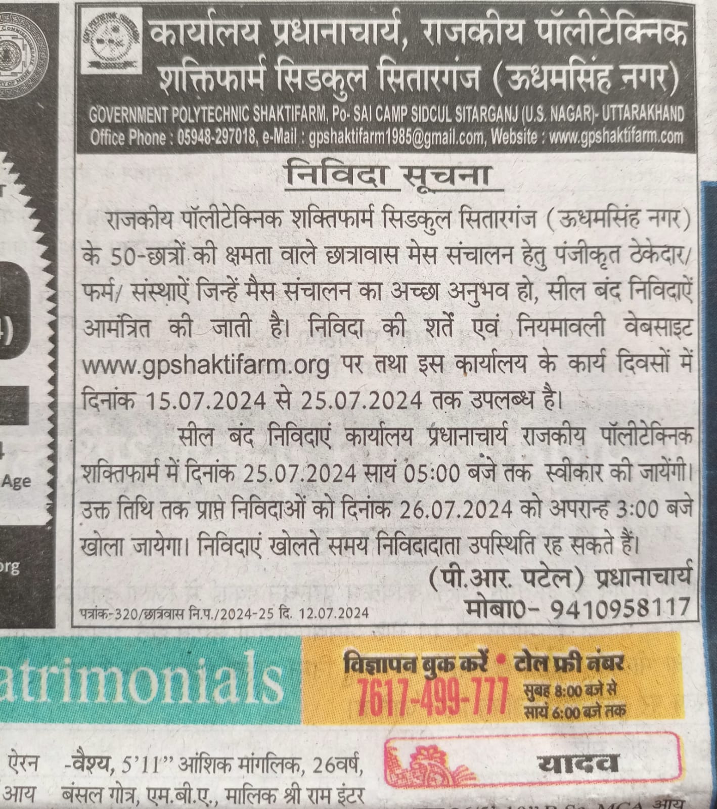 Government Polytechnic Shaktifarm was established in 1985 and now affiliated to Uttrakhand Board of Technical Education, Roorkee (Haridwar) under the Directorate of Technical Education Uttrakhand, Srinagar Garhwal. The polytechnic cources are approved by All India Council for Technical Education (AICTE) New Delhi. It is one of the leading polytechnic in Uttarakhand. The polytechnic has commitment to provide quality and excellence in academic pursuits.